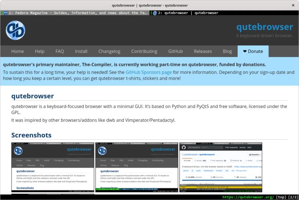 这个浏览与上面提到的稍有不同,qutebrowser 是一个以键盘为中心的浏览器,具有精简的 GUI。因此,你不会发现通常在其他浏览器中的按钮,如返回、主页、重新加载等。相反,你可以用键盘输入命令来运行 qutebrowser 中的功能。它使用 Vim 风格的键绑定,所以它适合 Vim 用户。如果你有兴趣在上网时获得不同的体验,你应该试试这个浏览器。