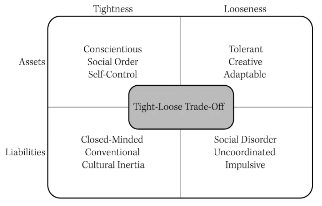从广义上讲,松散的文化倾向于开放,但它们也更加无序。另一方面,紧密的文化有令人欣慰的秩序和可预测性,但它们的容忍度较低。这就是紧与松的权衡:一个领域的优势与另一个领域的劣势并存。