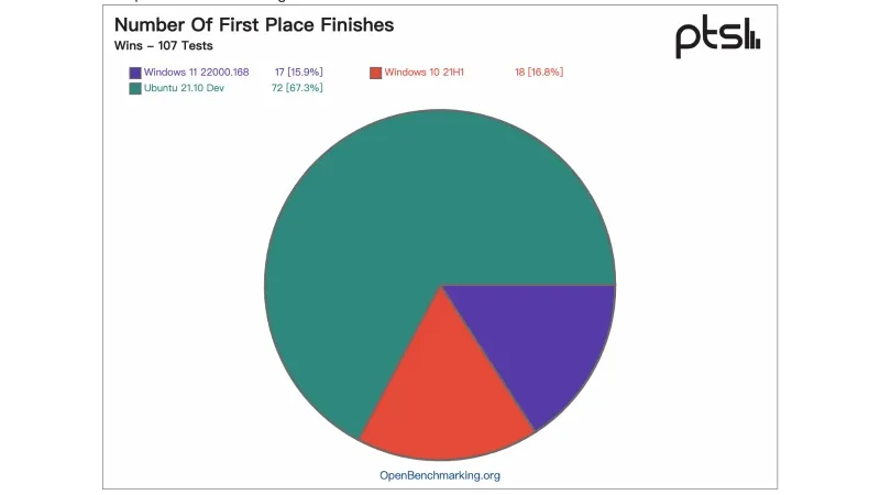 Windows 11 和 Ubuntu 21.10 几乎会在 10 月份前后脚发布。根据 Phoronix 的测试,在 107 项不同的测试中,Ubuntu 21.10 在 67% 的测试里处于领先地位,而其余的胜利则由 Windows 10 和 Windows 11 瓜分。总的来说,Windows 11 内部预览版在一些工作负载中仍然落后于 Windows 10,但总体上与 Windows 10 21H1 性能相当。