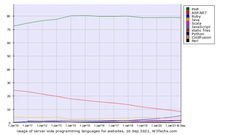 根据 W3Techs 今天发布的一份报告,PHP 在 2010 年的市场份额为 72.5%,而在 2021 年占比达到 78.9%。只有一个其他的服务器端语言曾经突破 10% 的份额,这个竞争对手是 ASP.NET,它在 2010 年拥有令人印象深刻的 24.4% 的份额,但在 1 月份下降到 9.3%,这个月下降到 8.3%。本次调查涉及热门网站,而非仅限于一些精英网站,并且在调查中避免来自域名停放服务和垃圾邮件发送者的数据歪曲,尽量契合当前的互联网现实。