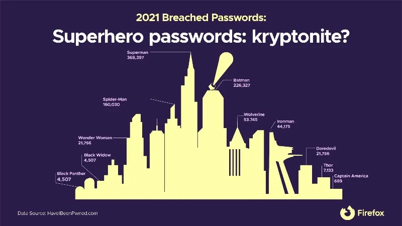 Mozilla 对密码泄露数据库的数据进行研究发现,数十万人使用他们最喜欢的超级英雄作为密码。在这些密码泄露事件中,“超人(Superman)”出现了 36 万次,“蝙蝠侠(Batman)”出现了 22 万次,“蜘蛛侠(Spider-Man)”出现 了 16 万次。金刚狼和铁人也出现了几千次。甚至连这些角色的扮演者的名字也经常被用于密码,尤以金刚狼的扮演者詹姆斯·豪利特受欢迎。
