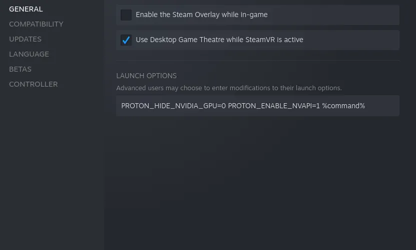 最后,你需要在“ 启动选项 ”中插入命令:PROTON_HIDE_NVIDIA_GPU=0 PROTON_ENABLE_NVAPI=1 %command% 。
