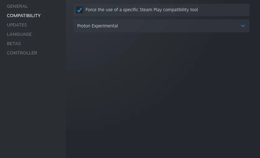 这可以通过右键点击游戏并选择“ 属性 ”来完成。然后在“ 兼容性 ”下,你需要勾选“ 强制使用特定的 Steam Play 兼容工具 ”复选框。接下来,从下拉菜单中选择 “Proton Experimental”。
