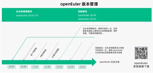 欧拉采用了定期发布版本的发行计划,每两年发布一个长期支持版本(LTS)。除了作为服务器操作系统所重视的长期支持和特性稳定之外,欧拉也是一个技术孵化器,它每半年发布一次的创新版,集成了社区的最新技术成果,将社区验证成熟的特性逐步回合到发行版中。从 2020 年 3 月发布第一个 LTS 版本之后,它已经发布了三个创新版本,按照计划,下一个 LTS 版本将于 2022 年 3 月到来。