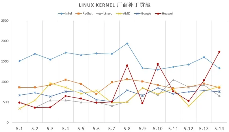 华为在芯片架构、ACPI、内存管理、文件系统、介质、内核文档、内核质量加固及代码重构等方面,十余年来总计向社区贡献 17000+ 个补丁。而在 Linux 内核 5.10 和 5.14 版本中,欧拉内核研发团队代码贡献量排名全球第一。