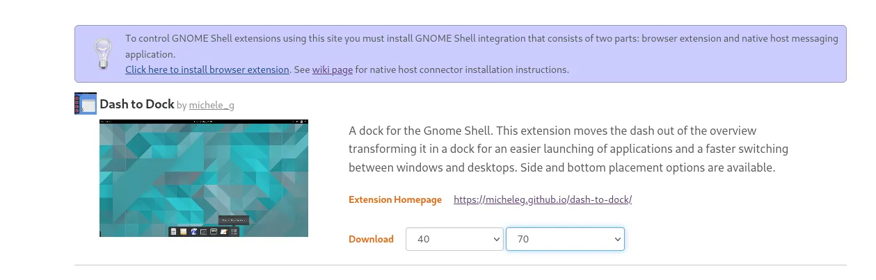Dash to Dock v70 增加了对 GNOME 40 的支持,并放弃了对较旧版本的 GNOME Shell 的支持。但是,你可以继续使用旧版本。