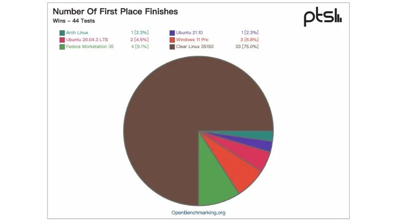Phoronix 本周进行了一些有趣的 性能测试。所有 44 项测试的几何平均值显示,在当前这一代英特尔平台上,Linux 明显领先于 Windows 11。在这个系统上,Ubuntu / Arch / Fedora 总体上比 Windows 11 Pro 快 11% 左右。Clear Linux 比 Windows 11 快约 18%,总体上比其他 Linux 发行版的性能高约 5%。Clear Linux 获得了 33 项的第一,Windows 11 Pro 获得 3 项第一。