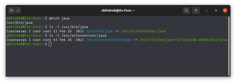 在我的示例中,可执行文件的位置是 /usr/lib/jvm/java-11-openjdk-amd64/bin/java 。对你来说可能会不一样。在你的系统中,复制上述命令所获取的正确的路径。你知道,你可以 在 Ubuntu 的终端中复制和粘贴 。