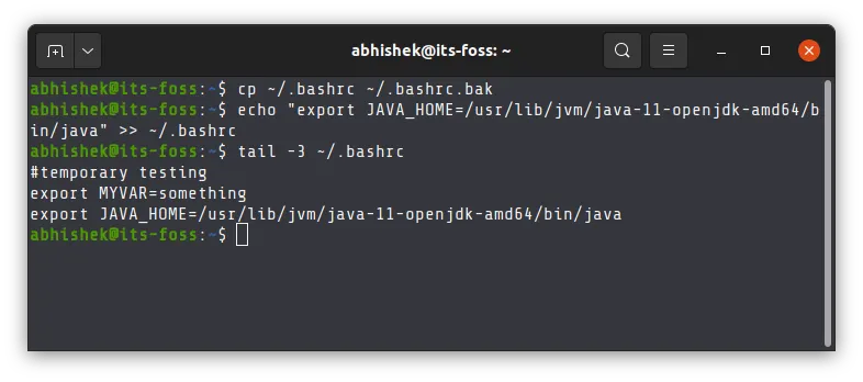 这尚未结束。你刚刚声明的 JAVA_HOME 环境变量是临时的。如果你关闭这个终端或开始一个新的会话,它将会再次变成空的。