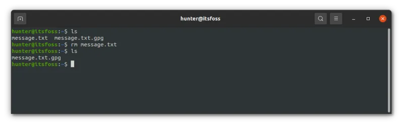 现在让我们删除未加密的 message.txt 文件,这样你就可以看到 message.txt.gpg 文件实际上在没有原始文件的情况下也能正常解密。