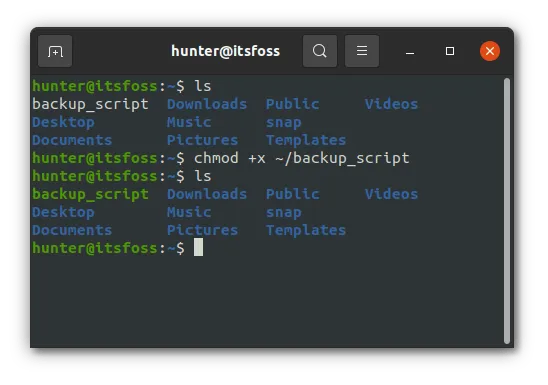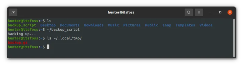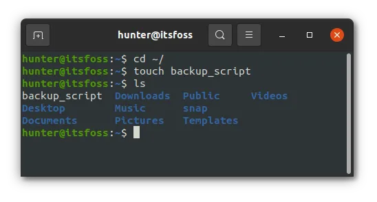 首先,我们在家目录(~)下创建该脚本,命令为 backup_script,如下图所示: