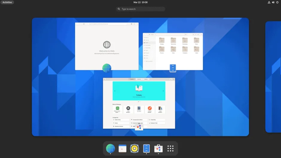 GNOME 40 换成了三指轻扫的水平布局。这种水平方式使得第 40 版在用户界面和用户体验上与之前的版本有很大不同。