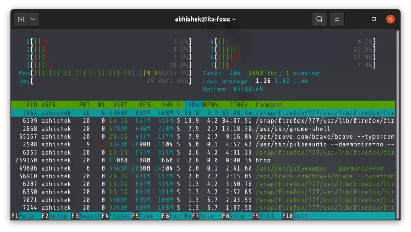 另一方面,htop 有一个漂亮的彩色输出,并且界面比 top 命令更直观。你可以垂直和水平滚动,以图形方式配置显示的信息。你可以在 htop 的输出屏幕上交互式地杀死进程。