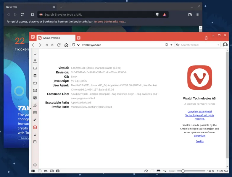 我使用 Pop!_OS 21.10 作为我的 Linux 发行版,而测试的浏览器版本为 Vivaldi 5.0.2497.51 稳定版 和 Brave 97.0.4692.99。
