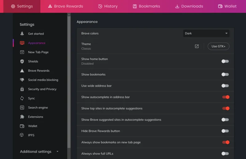 不过,Brave 也为你提供了定制现有界面的选项,例如使用更宽的地址栏、显示完整 URL、显示标签搜索按钮、显示或隐藏主页按钮等。