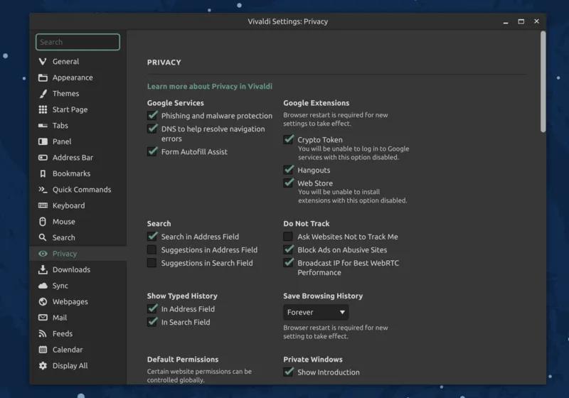 Vivaldi 专注于提供隐私友好型网络体验,就和 Brave 一样。它内置了原生的广告 / 跟踪拦截保护,以及专门用于自行调整体验的隐私设置。