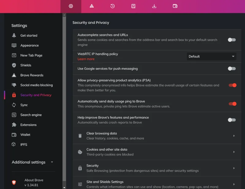 Brave 同样给你类似的控制级别,当然也有更高级的设置项,比如修改 WebRTC IP 处理政策,以及消息推送服务控制。