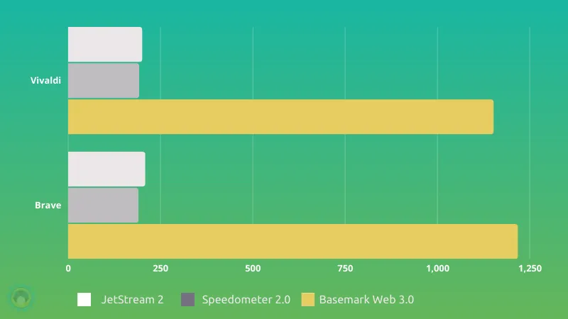 在这些基准跑分测试中,Brave 总体更快,但 Vivaldi 在 Speedometer 2.0 中得分更高。