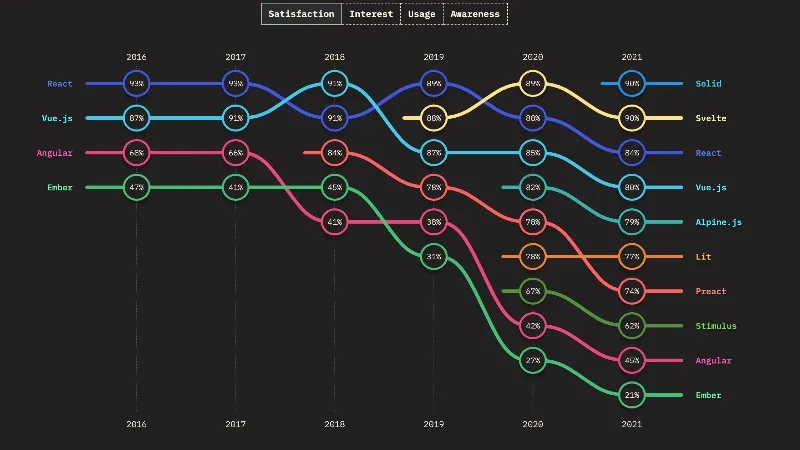 从专门 针对 JavaScript 的 2021 年度调查中可以发现,在 JavaScript 框架和库方面,React 的使用率继续领先,其次是 Angular 和 Vue.js。React 的满意度明显下降,在 Vue.js、Solid 和 Svelte 之后排名第四。Solid 在满意度方面排名第一,在兴趣方面排名第二,即使在实际使用它的人方面排名倒数第二。