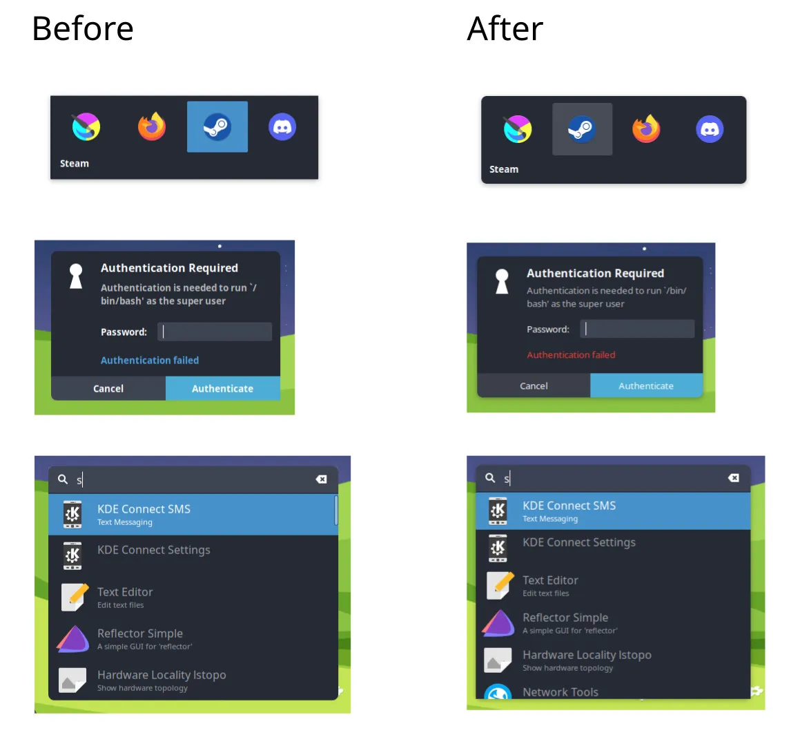 例如,边框圆角已经应用于一些桌面元素,统一的间距,统一的小工具的颜色方案,以及对 GTK 主题支持的其他改进。