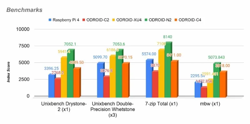 ODROID C4 搭载效能很高的 Amlogic S905X3 SoC,具有 4 个最高主频为 2GHz 以上的 Arm Cortex-A55 处理器核心,下图是 ODROID C4 与其他 ODROID 及树莓派 4 的 CPU 跑分对比,性能略优于树莓派 4。主频高达 650MHz 的 Mali-G31MP GPU的跑分也给大家列出来了。