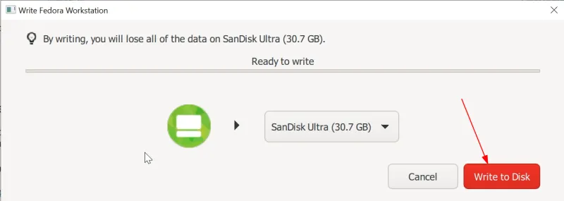 在安装完成后,运行 “Fedora Media Writer” 工具。但是在此之前,确保你已经插入 USB 设备。