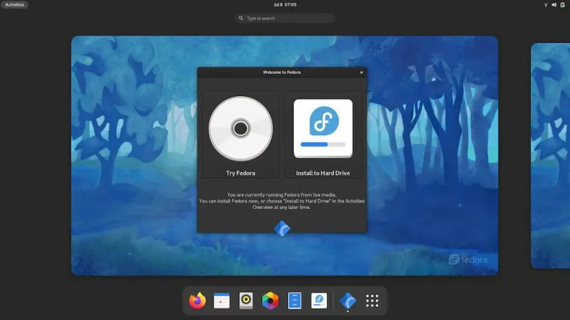在数秒后,你应该会启动到 Fedora 临场会话期间,并会看到尝试或安装它的选项。选择 “ 安装到硬盘 ” 。