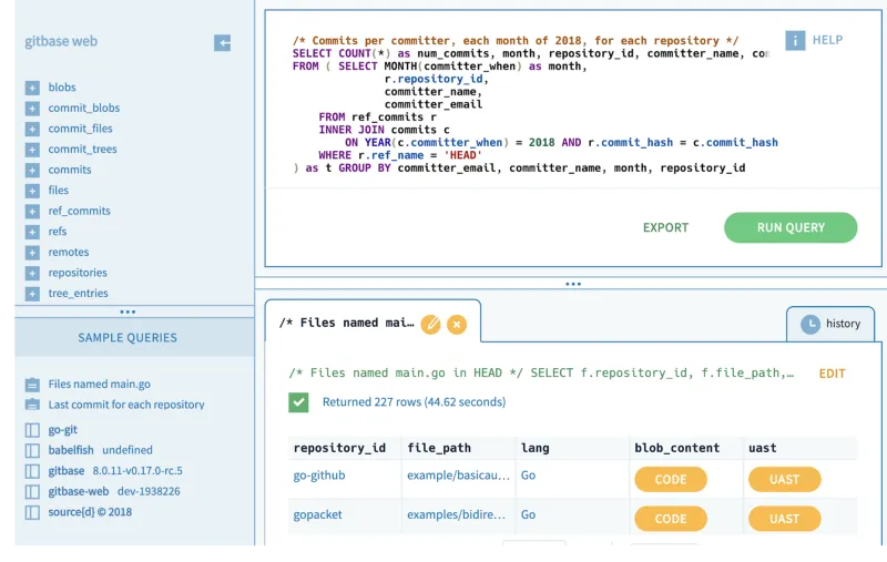 Gitbase 是一个由 Go 驱动的开源项目,它使得我们可以在 Git 仓库上运行 SQL 查询。