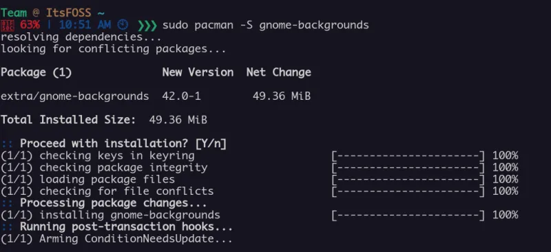 对于 基于 Arch 的发行版,请使用 pacman 命令,如下: