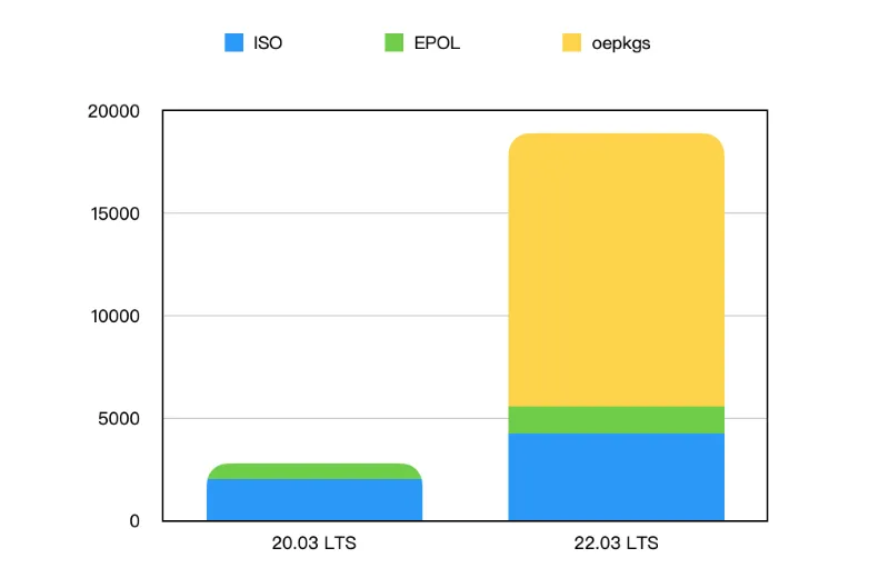 比如软件包数量:20.03 LTS 官方提供的软件包, 包括 ISO 镜像中的 2016 个、EPOL 仓库中的 762 个,总计 2778 个;而在 22.03 LTS 中,软件包数量达到了 ISO 4241 个、EPOL 1329 个、oepkgs 13323,总计 18893 个!达到了两年前的 6.8 倍。