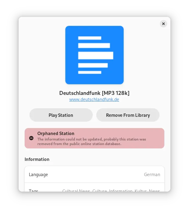 因此,即使一个电台从服务器(radio-browser.info)上删除,它也会保留在应用程序中,并有消息通知用户这一变化。