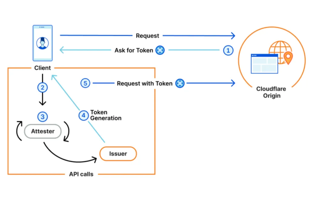 2. 你的设备制造商。他们只会知道那些用于验证设备是否真实所需的设备数据,而不会知道你正在访问哪个网站,或你的 IP 地址是什么。验证了你的设备后,他们将生成一个令牌,该令牌将发送到 Cloudflare。