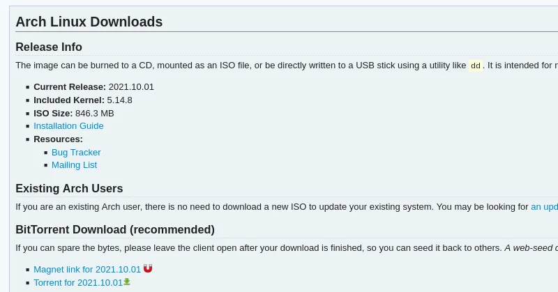 完成后,你需要到 Arch Linux 官方网站 下载 ISO 文件。你应该找到 使用 torrent 下载 或直接下载文件的选项。