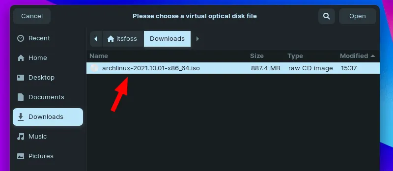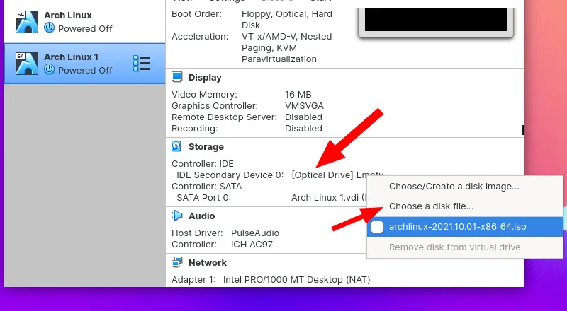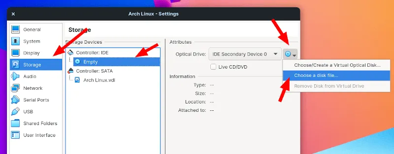 在这里,你必须单击 “ 控制器 ” 下的 “ 没有盘片 ”,然后继续选择 Arch Linux ISO 文件作为磁盘文件(如上图所示)。