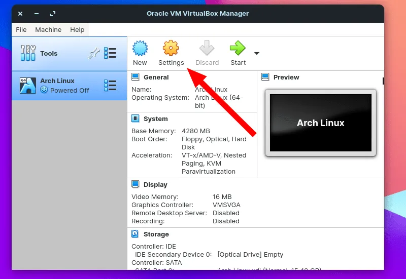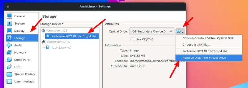 一切就绪!在启动安装了 Arch 的虚拟机之前,你还需要做一件事 —— 移除选择作为光驱的 ISO 磁盘。与添加启动 ISO 的方式类似,你可以前往虚拟机设置并将其删除,如下所示: