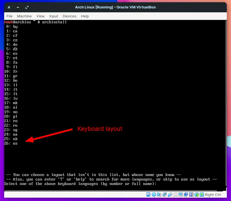 第二步:根据你的要求选择键盘布局,美式布局应该是最常见的选择。简单地输入一个数字即可进行选择,如下图所示(例如,26):