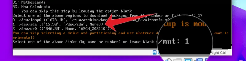 第四步:选择区域后,它会要求你选择驱动器进行安装。在这个例子中,我们已经创建了一个大约 15 GB 的虚拟驱动器,显示为 /dev/sda。