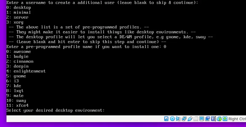 然后,你将看到一个选择配置文件的选项。在这种情况下,我们需要一个成熟的 Arch Linux 桌面。因此,我们通过输入 0 来选择 “ 桌面 ”。