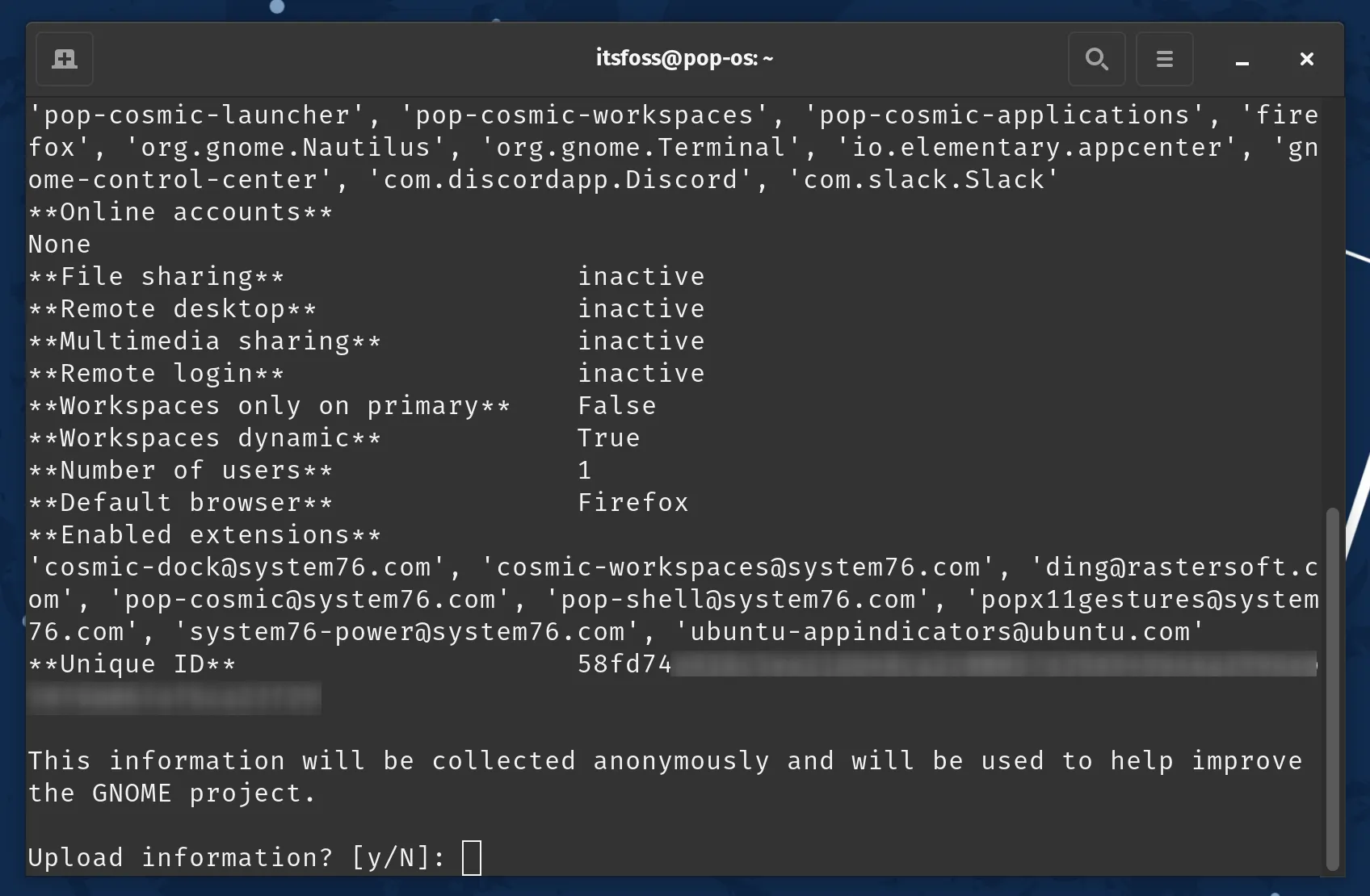接下来,它会显示它打算与 GNOME 共享的数据。所以,如果你觉得没问题,你可以选择将数据上传到 GNOME 的服务器上。