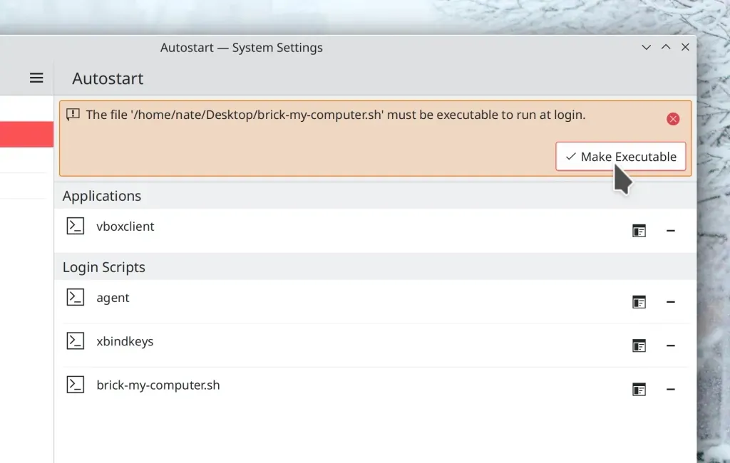 另一个例子包括,如果你在系统设置的 “ 自动启动 ” 窗口的 “ 登录脚本 ” 部分添加一个 Shell 脚本,而该脚本没有被标记为可执行,就会显示一个警告。此外,它还包括一个按钮,单击即可设置为可执行。