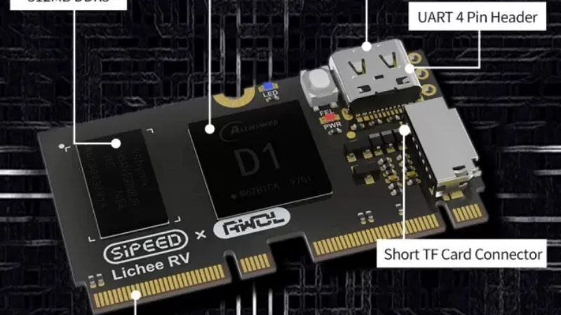 除了支持赛昉的昉·星光和全志的哪吒 RISC-V 板卡外,Canonical 工程师也在努力为下个月的 Ubuntu 22.10 添加更多的 RISC-V 板卡支持。他们正在为一款起价为 16.90 美元的 RISC-V 板卡 Sipeed Lichee RV 提供支持。它是一块带有 M.2 接口的计算模块板,可以连接到载体板。它使用全志 D1 SoC,采用单核玄铁 C906 64 位 RISC-V 处理器,运行频率仅为 1.0GHz。这是一块非常便宜但很慢的板卡,适用于物联网领域。
