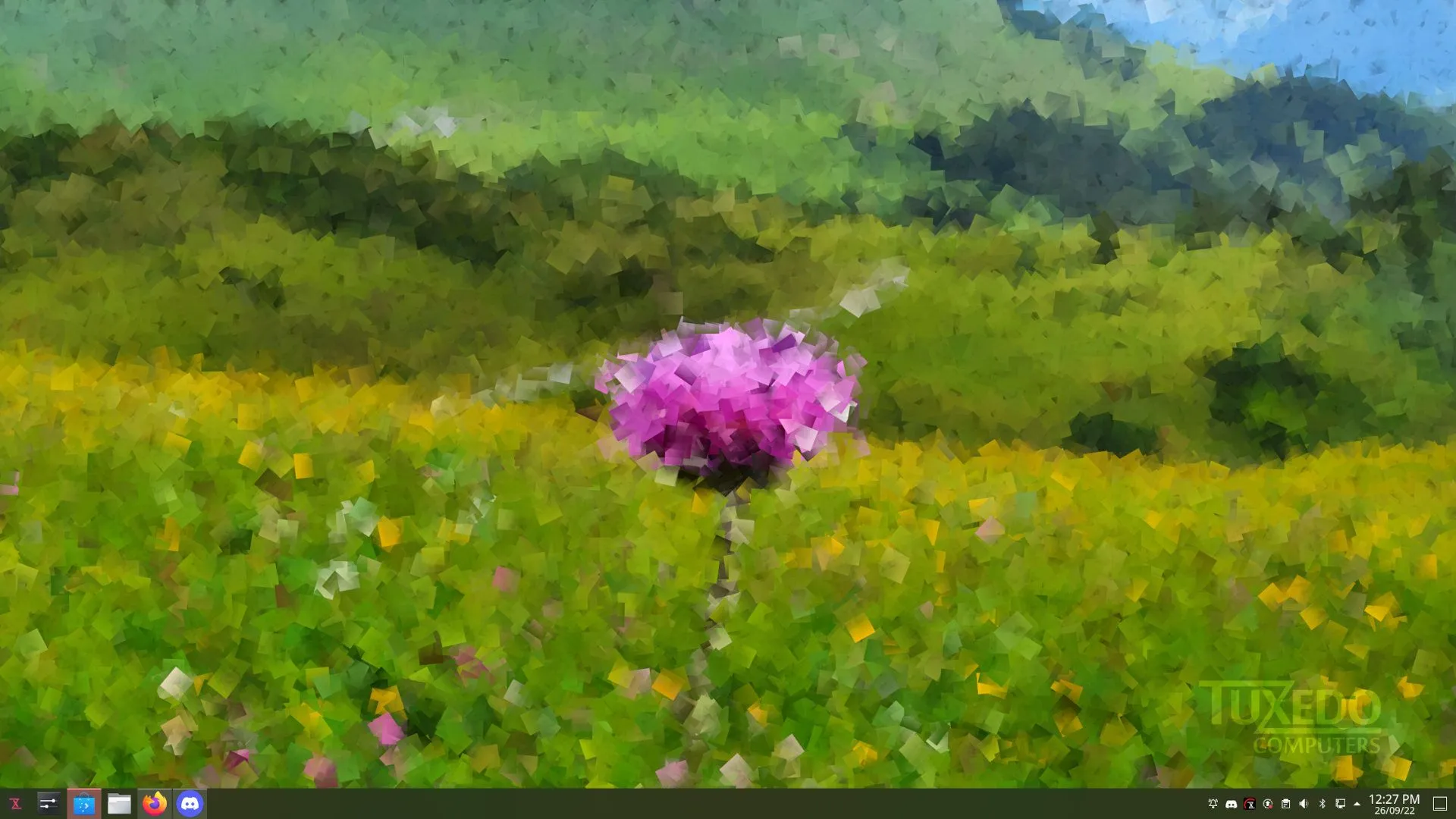 你会在应用和菜单上发现带有红色调的 TUXEDO 徽标。它还具有令人耳目一新的壁纸。