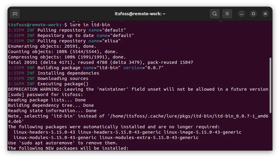 因此,如果它在其仓库(或任何其添加的仓库)中没有找到一个包,它就会转到系统的默认仓库,并从那里安装它。就像我用 lure 命令在我的系统上安装/移除 neofetch 一样。