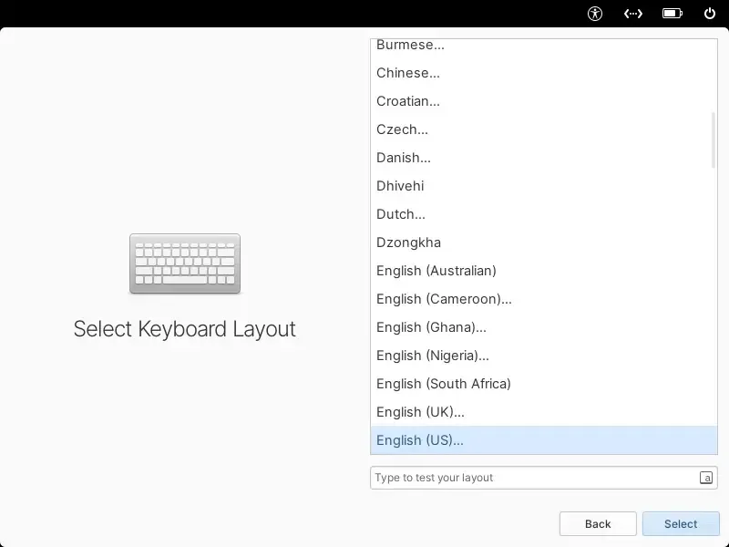 在这一步,你将被要求选择键盘布局,然后点击“ 选择 ”。