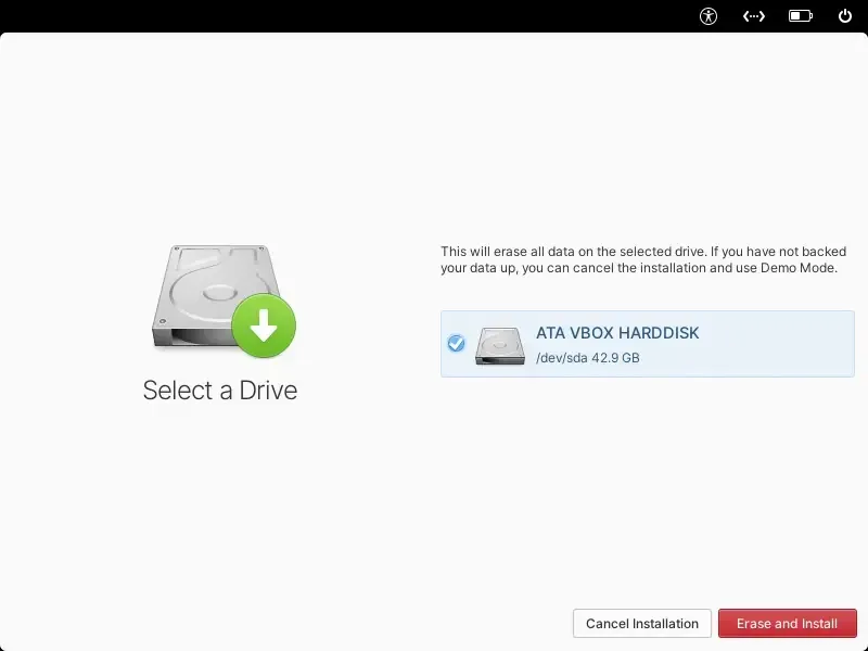 在下面的屏幕上,选择要安装操作系统的驱动器,然后点击“ 擦除并安装 ”。
