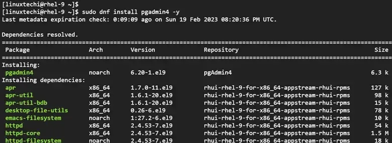 安装好 PgAdmin4 和 EPEL 仓库后,继续使用 DNF 包管理器安装 PgAdmin4,如下所示: