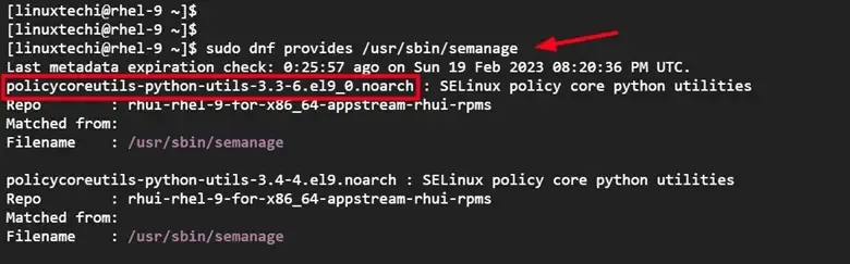 从输出中,你可以看到 semanage 是由 policycoreutils-python-utils-3.3-6.el9_0.noarch 包提供的。