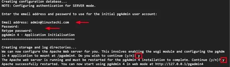 再一次如下运行 Pgadmin4 安装脚本。 提供电子邮件地址和密码,在提示时输入 y
