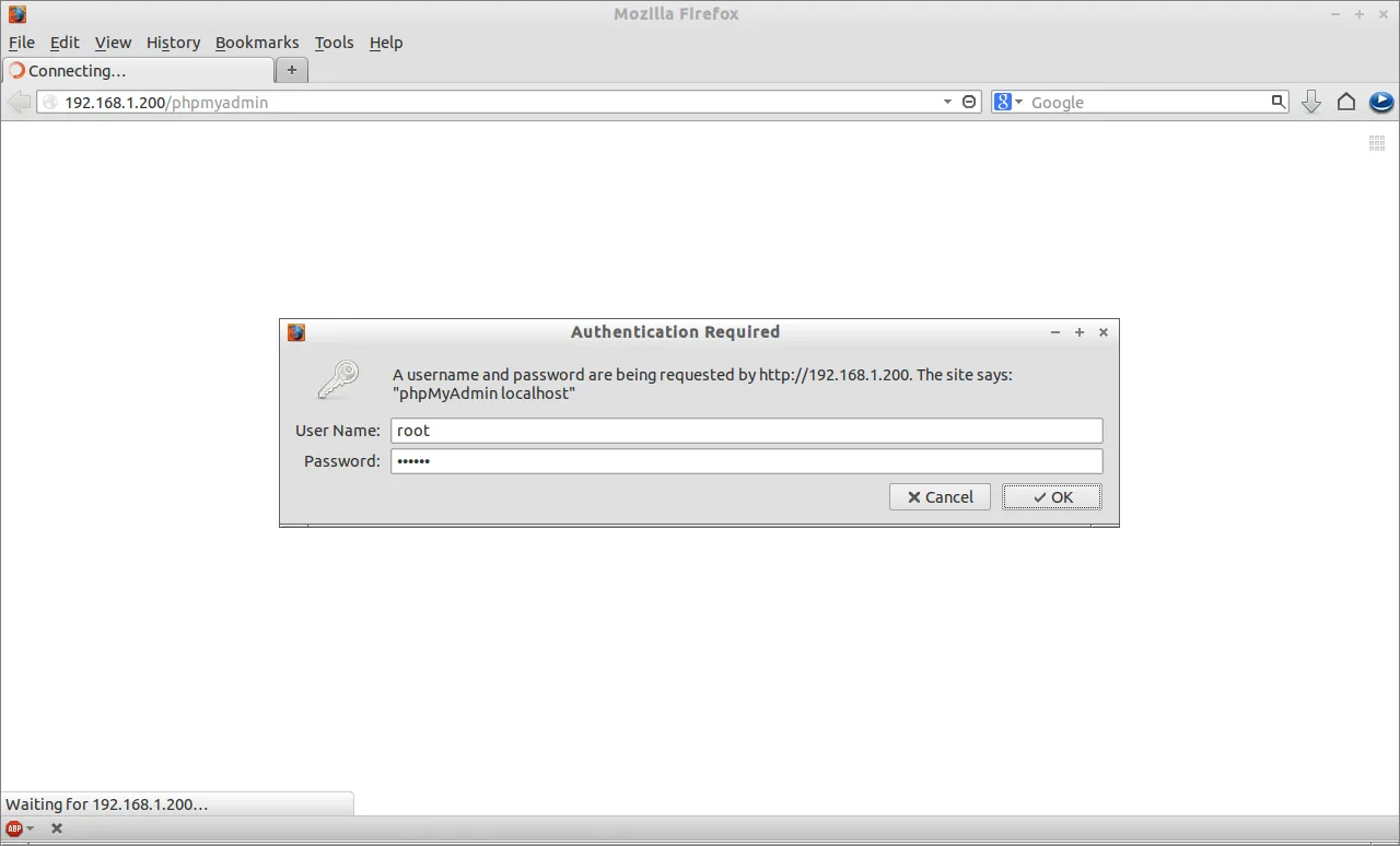 现在,您可以访问 phpmyadmin 控制太来管理 MySQL 了。打开一个浏览器,访问:http://server-ip-address/phpmyadmin/ 。需要输入您的 MySQL 用户名和密码,如果您按前面的步骤设置了密码的话。我设置的是 “root” 和 “centOS”。
