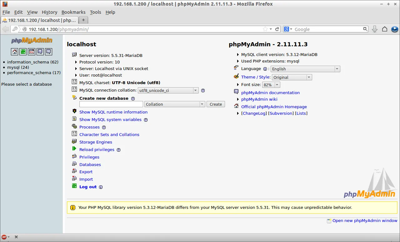 您将被重定向到 phpMyAdmin 的 Web 主界面: